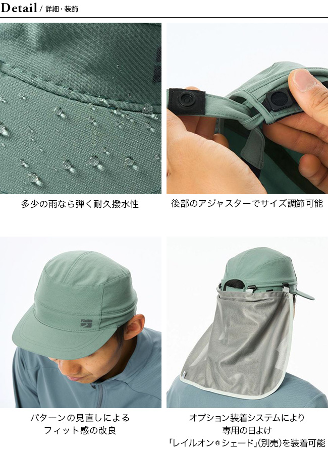両サイドから後頭部にかけて、ツバ内部に設けている「レイルオン®システム」により、日焼けや熱中症予防に効果的な専用の日よけ「レイルオン®シェード」(別売)を装着することが可能です。