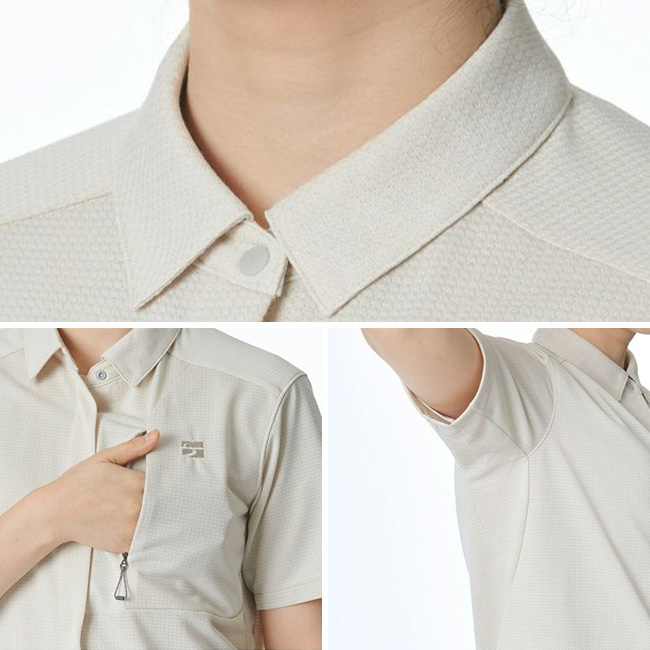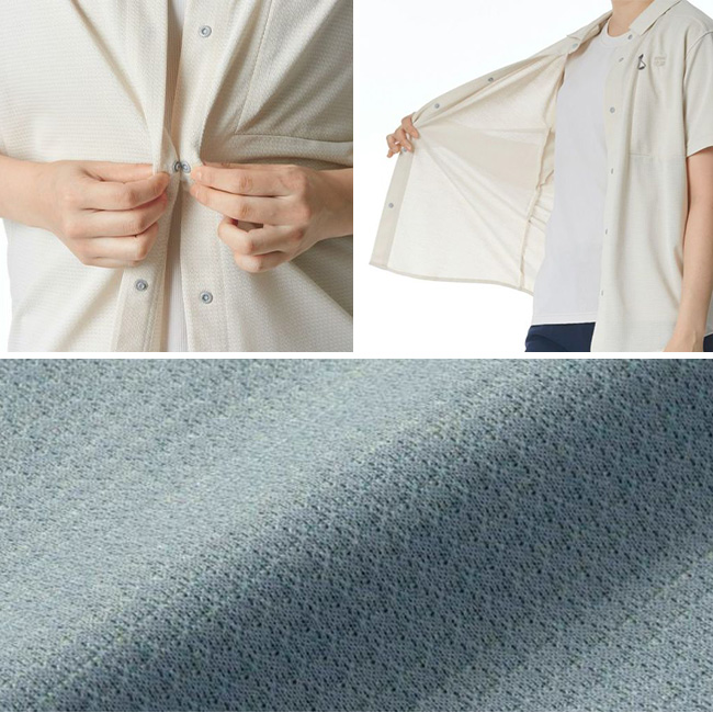 シャツとして一般的な織物を使わず、ニット地にすることで高い通気性と動きやすさを実現しました。ニット素材には独自素材のラミースピン®糸と半永久吸汗を可能にする特殊ポリエステルをハイブリッドし、ベースレイヤー並みの優れた吸汗速乾性も備えます。