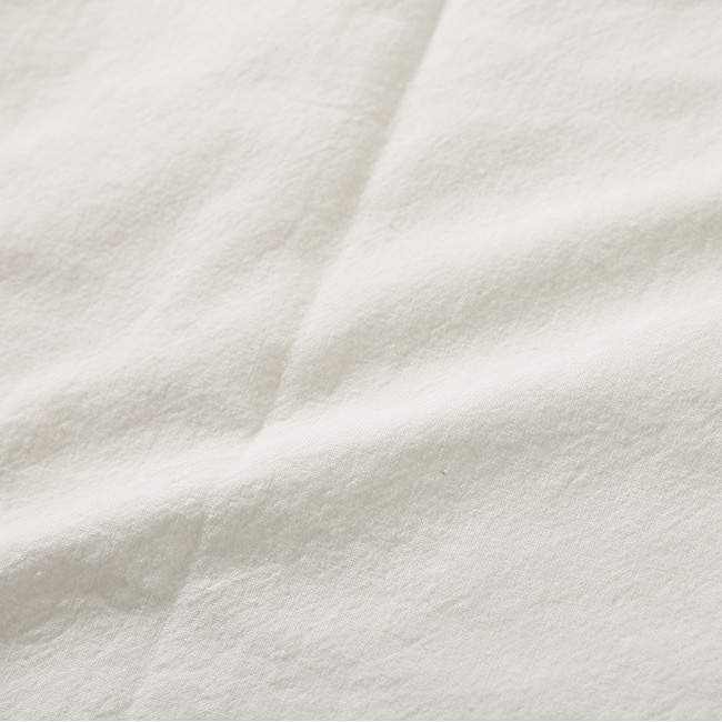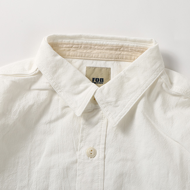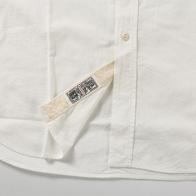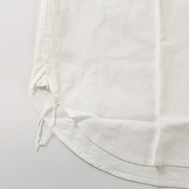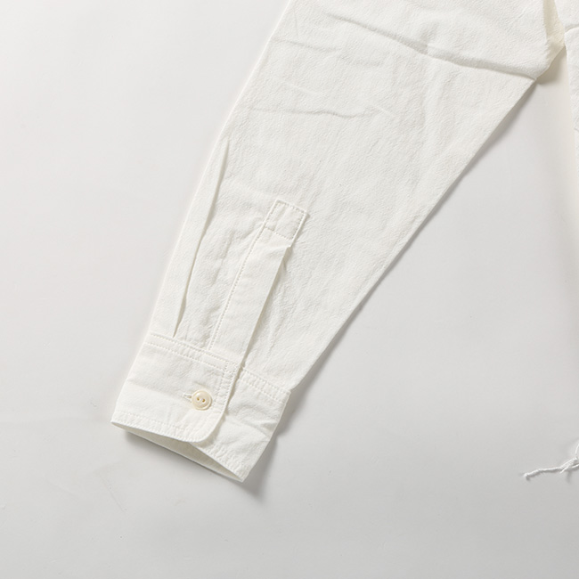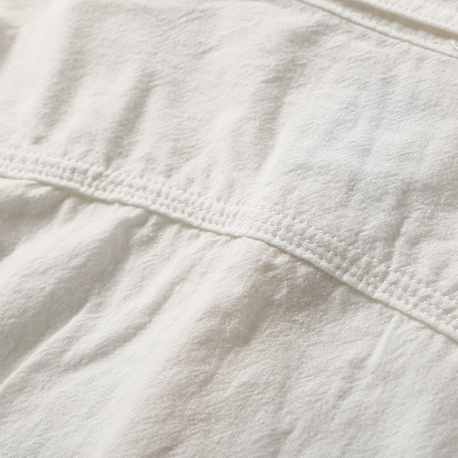 強撚に糸を撚って撚りが戻る性質を利用してシボを作る「開燃」に成功した 『一生着用できると言っても過言ではない』オックス素材をオリジナルで製作。白素材でも、経年変化が楽しんで頂けます。