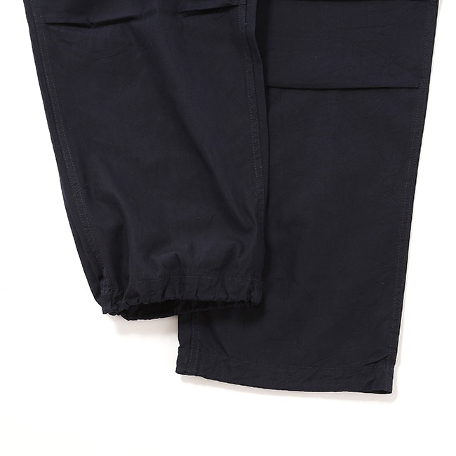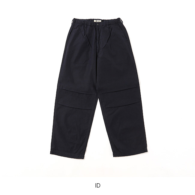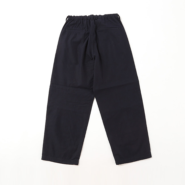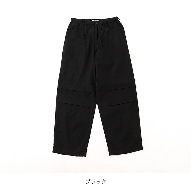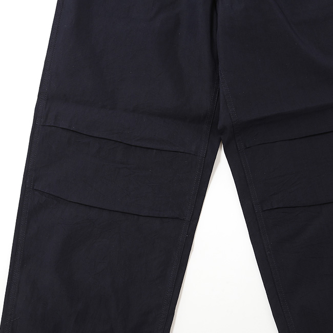 インディゴ染めした綿糸とブラックのナイロン糸の混紡素材を製作。フロント部分にタック、膝部分にミリタリーカーゴパンツによく見られる膝タックを入れ可動域を広げています。