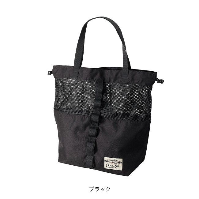 上半分をメッシュ地にすることにより通気性に優れ、濡れ物の収納にも最適。肩掛けはもちろん、上部ドローコードを絞ることで巾着状にすることも可能です。