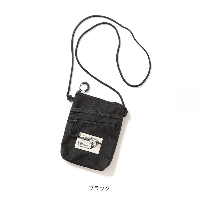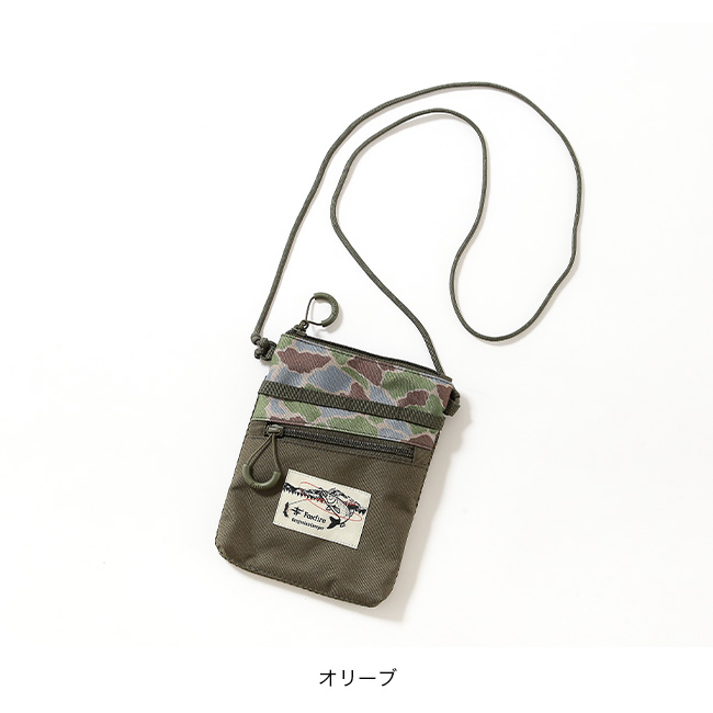 Foxfireオリジナルのフィッシュアイカモフラージュ柄をプリントした首掛けトラベルウォレットです。スマートフォンサイズのポケットとコインパースの2気室構造。