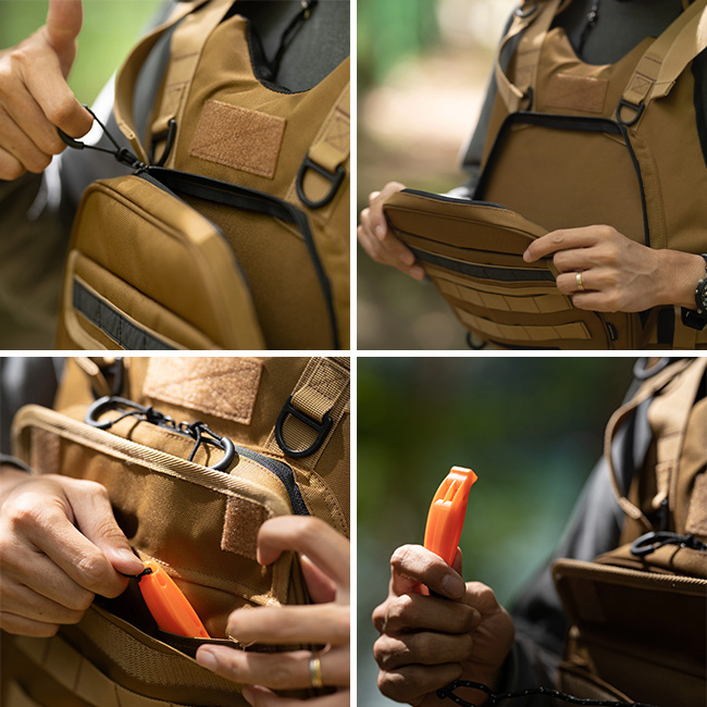 前面のDリングやMOLLEシステム、マジックテープを活用して自分仕様にカスタム可能も可能です。