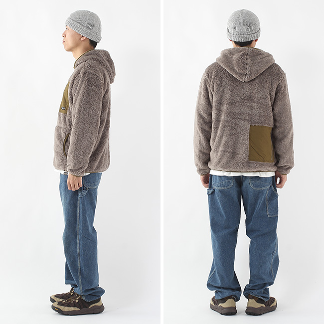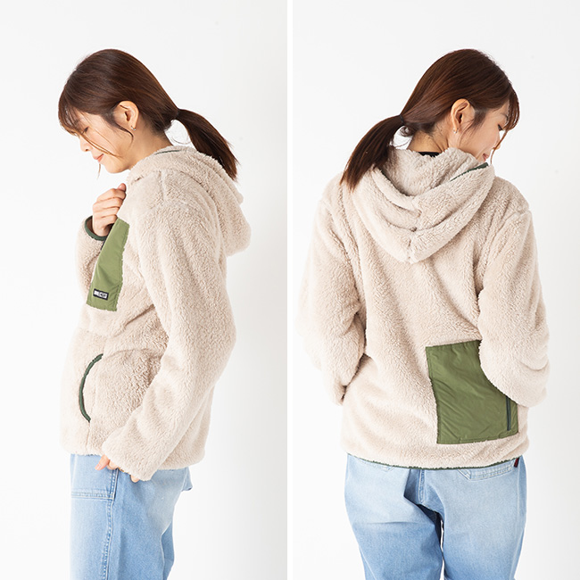 毛足が長く手触りが心地よいフリース素材を使用したフーディー。