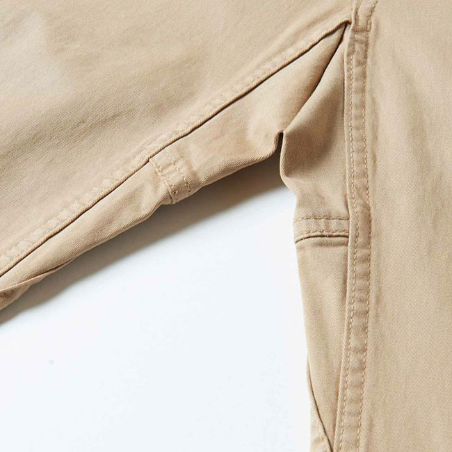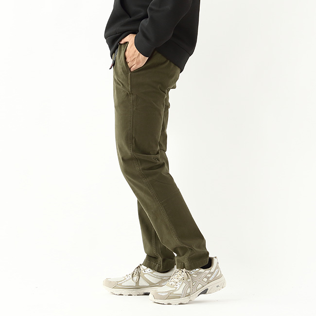 裾にかけて細くなるテーパードシルエットですが、伸縮性に優れ、程よいハリコシのある、オーガニックコットン使用のストレッチツイルを使用していますので、アクティブなシーンにも対応可能です。