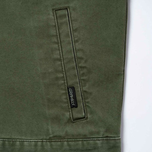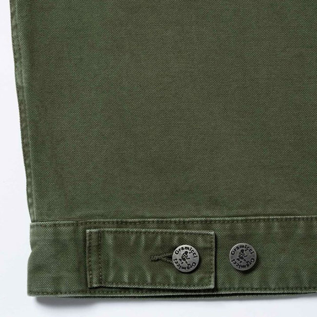 両腰のポケットに加え、左胸にジップポケットを備えたジップアップジャケットは、ドライタッチな9oz.キャンバス素材で、製品加工による深い色合いです。■ブランド名:GRAMICCI