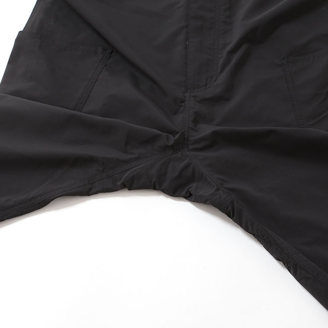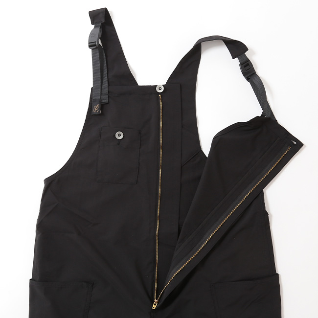 脱ぎ着やすいファスナー仕様のフロントと、股部分に脚の可動域を拡げるガゼットクロッチを採用、脱着式のウェビングベルトをショルダーベルトに起用しました。