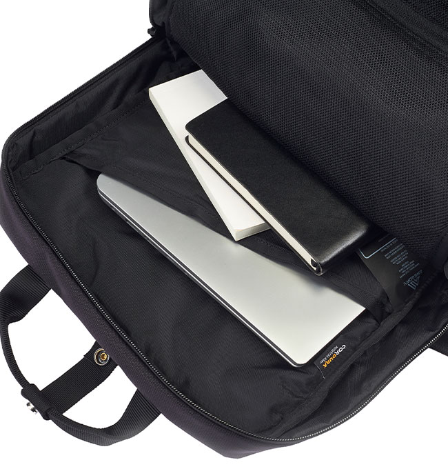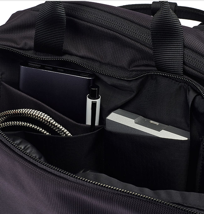ジッパー付きフロントトップポケットは内部にオーガナイザーとキーフォブ付き