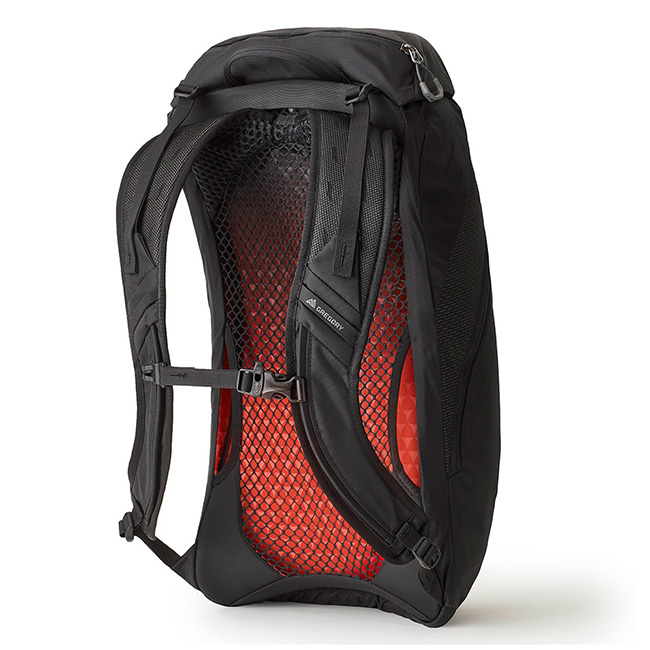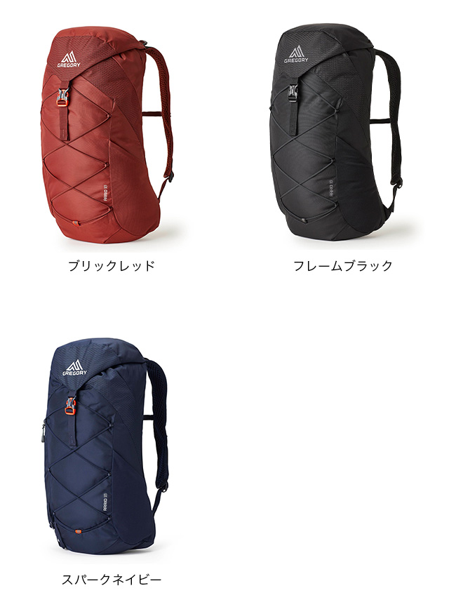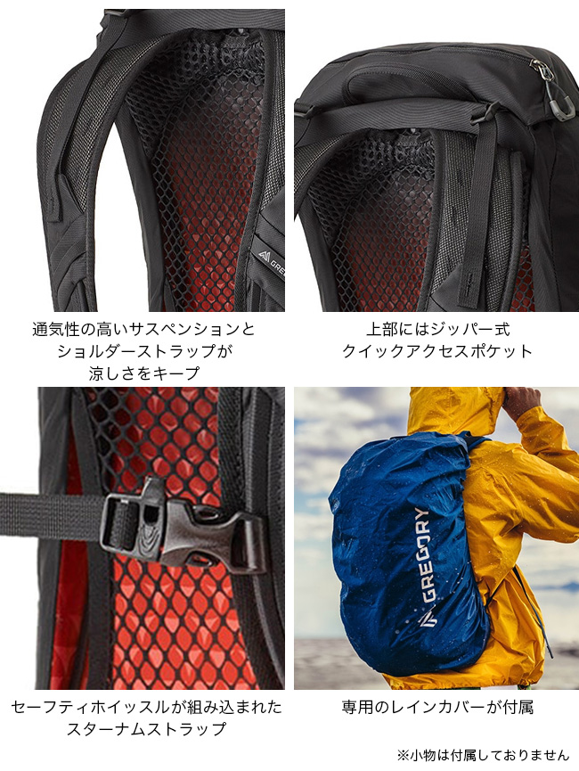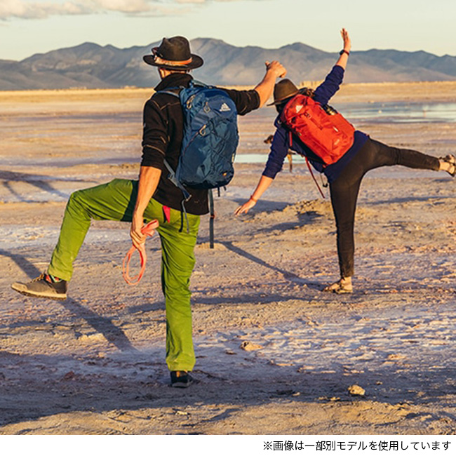 内部にはグレゴリーの速乾3Dハイドロリザーバー(別売)に適合するスピードクリップ取り付けシステム付きハイドレーションスリーブ。前面にはリフレクター付きウェビングループがついたバンジーシステム(18L、22L)
