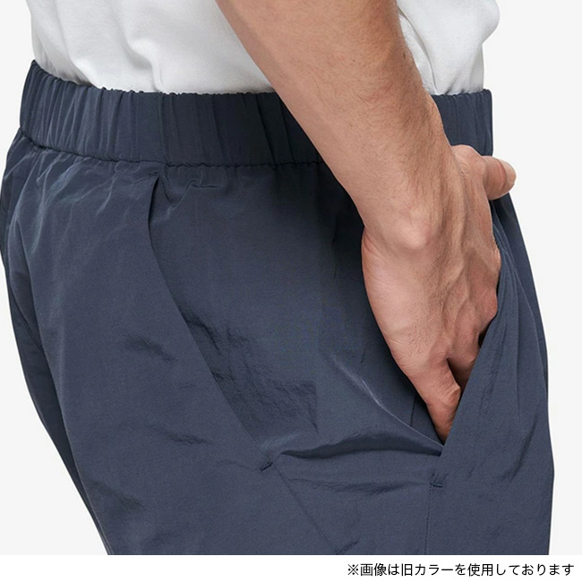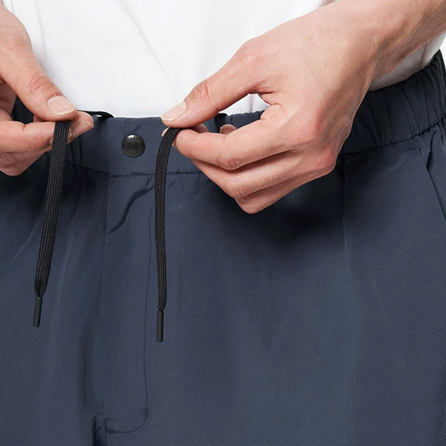 リサイクルナイロン100%素材で、独特のシャリ感がある風合いも魅力です。ウエストは、ゴム+ドローコードのイージー仕様。