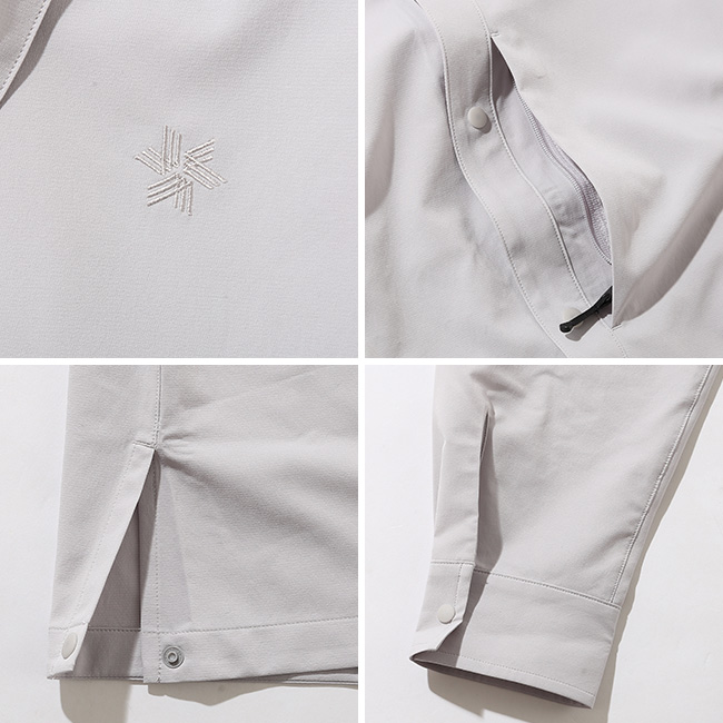 ウインドシェルとしても活用できる機能性と、洗練されたデザインを兼ね備えています。ストレッチ性に優れ、通気性を備えた二重織組織の薄手生地を採用。
