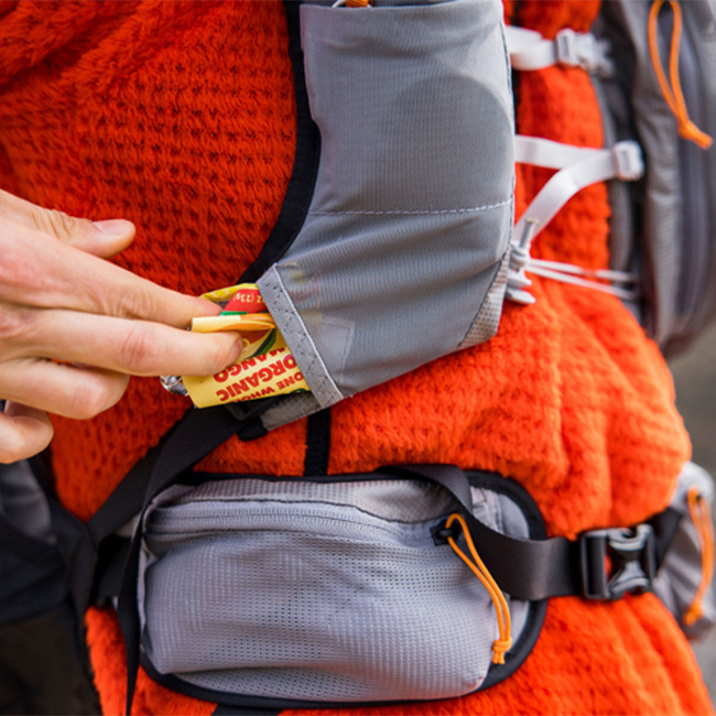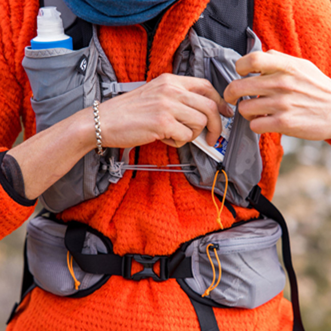 ベストタイプに近いショルダーハーネスで、手の届く範囲にあらゆるものを収納可能です。