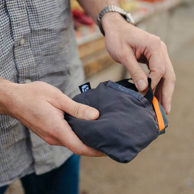 内側のメッシュポケットは収納時に本体をまとめられるパッカブルポーチとしても使用でき、持ち運びにも便利です。