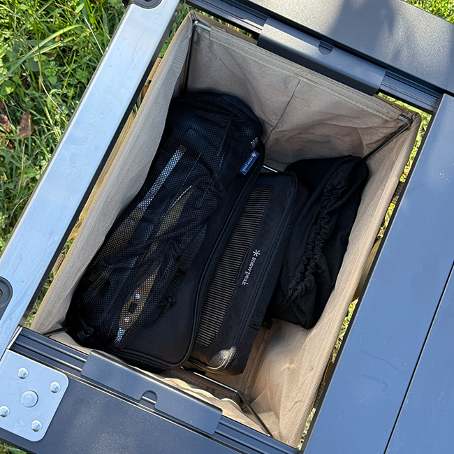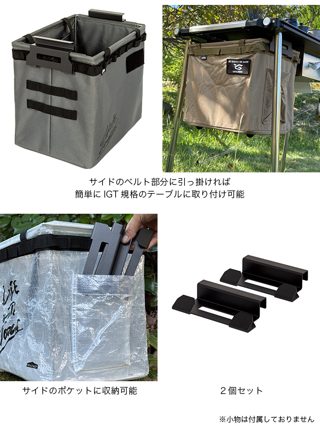 ワンタッチバケット本体のサイドのベルト部分に引っ掛けるだけで、簡単にIGT規格のテーブルに取り付けることが出来ます。収納時はワンタッチバケット本体のサイドのポケットにピッタリ収納する事が可能です。
