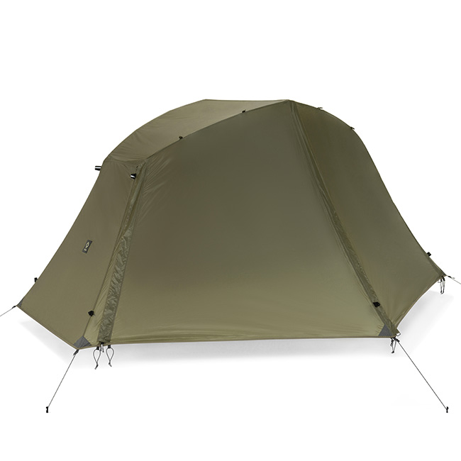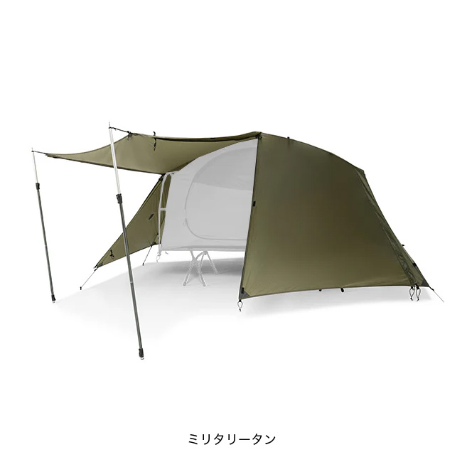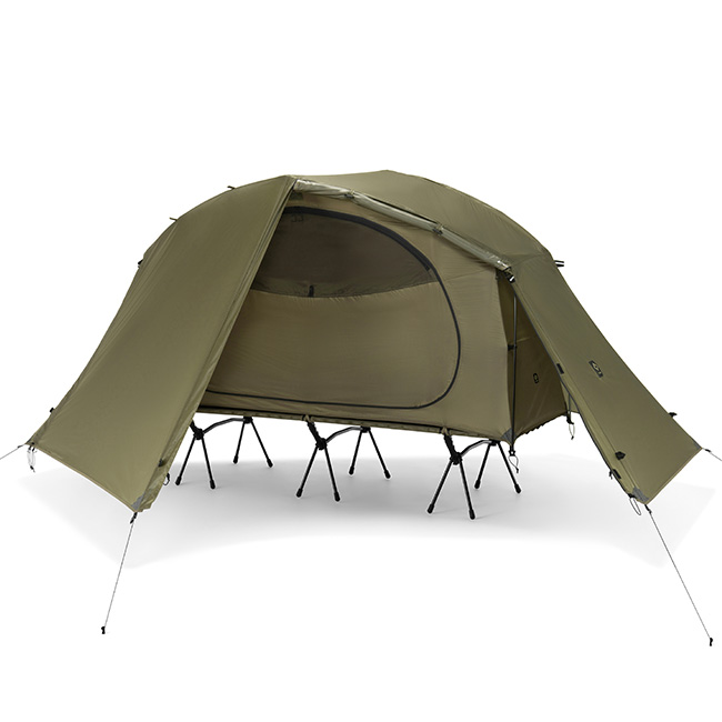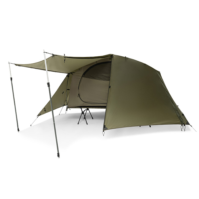 タクティカル コットテントソロを単体で野外で使用する際には必須のフライシートとなります。コットテントソロのフライの前面にある2つのドアを全て巻き上げて完全に開放する事ができます。