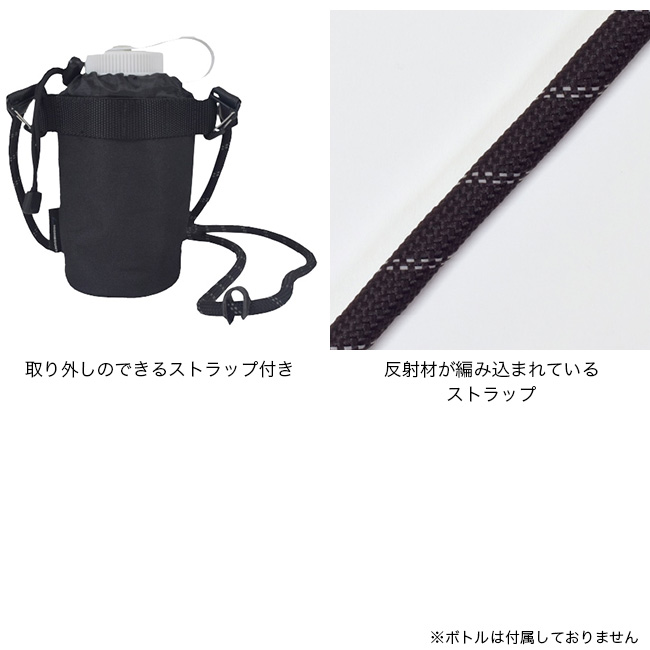 ストラップには反射材が編み込まれており、視認性と利便性に優れています。ナルゲンボトルの広口0.5L・細口0.5Lに加え、ペットボトルにも対応しています。
