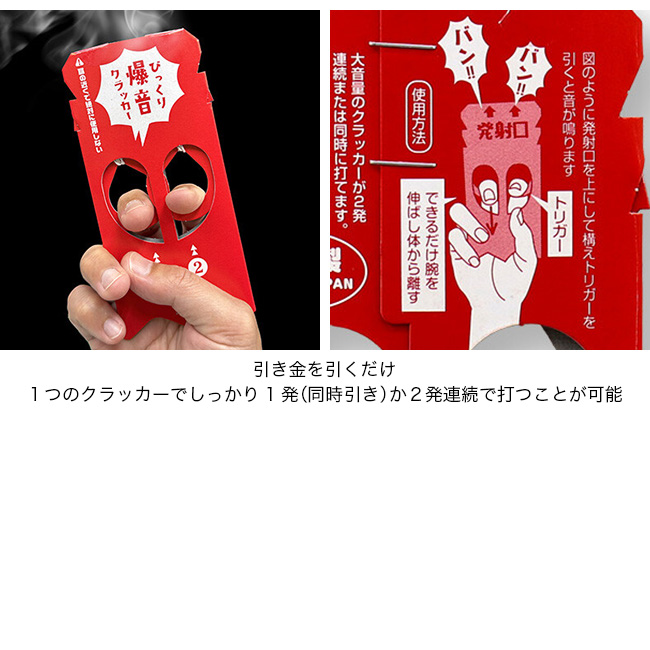 引き金を引くだけでカンタンに大きな音が鳴り、火薬の臭いがします。1つのクラッカーでしっかり1発(同時引き)か2発連続で打つことが出来ます!