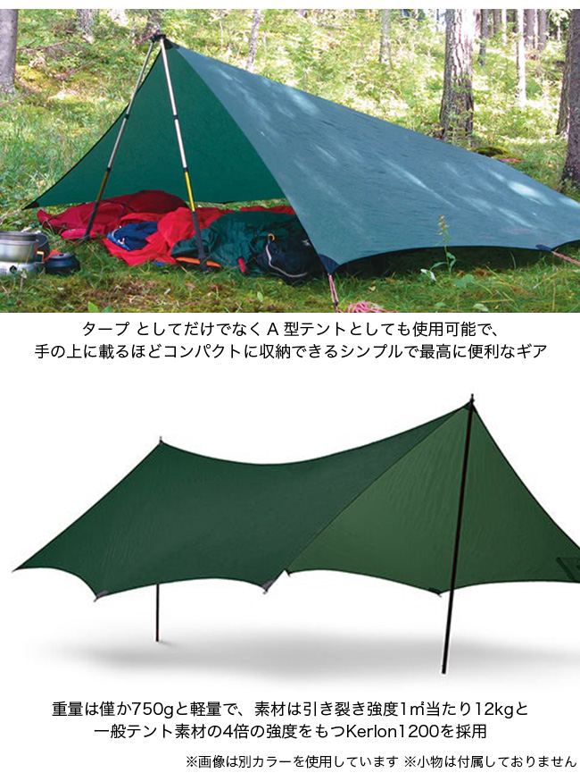 開放感あふれるタープは、天候から身を守りながら偉大な自然の音や香りを五感で感じることができます。素材には一般テント素材の4倍強度がある引き裂き強度1平方メートル当たり12kgを誇るKerlon1200を使い、ドローコード、収納バッグが一体にセットされ、重量は僅か750gです。