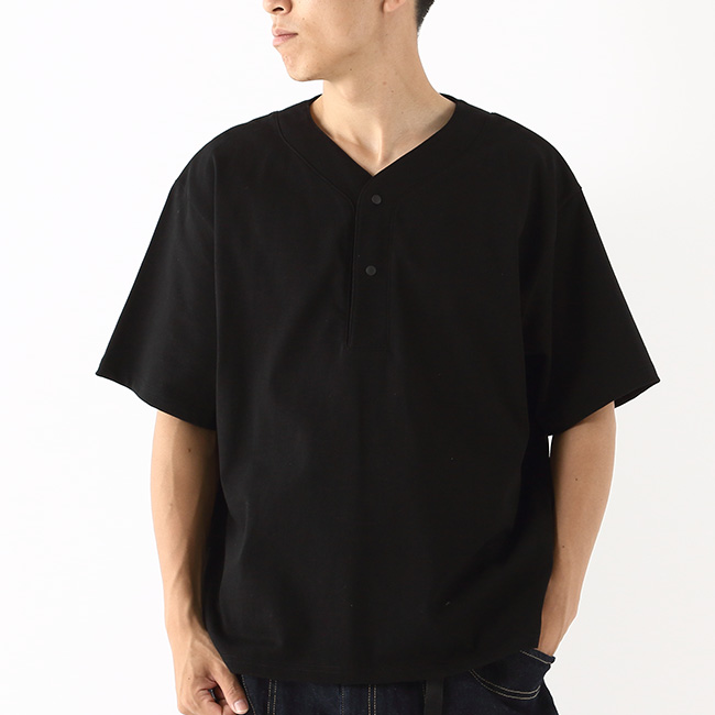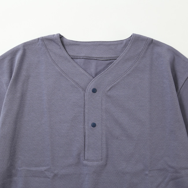 ボートネックを使ったバスクシャツから今回はベースボールシャツに。生地はデラヴェジャージーを使っていて、目が細かく編まれ、洗いざらしの自然な生地感とハリが特徴です。