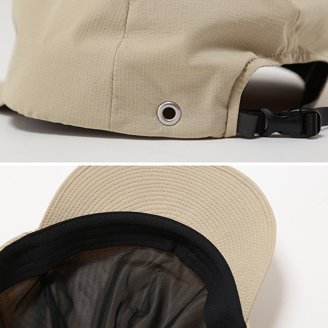 紫外線遮蔽率90%以上を持つ伸縮性ナイロンリップストップを採用し、裏地には銀イオンによる抗菌防臭・制菌性を有するメッシュを使用し機能面と軽さを重視しました。アジャスターベルトの片側には10mm幅の平ゴムを合わせ、フィット性を上げています。
