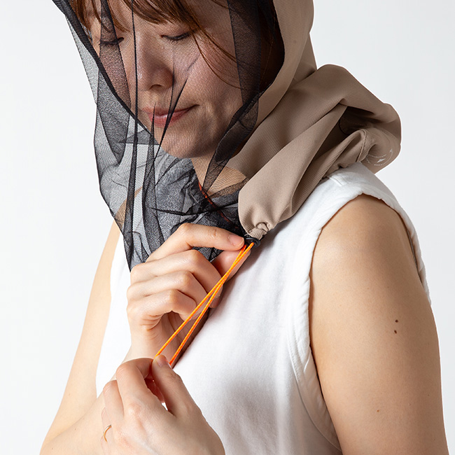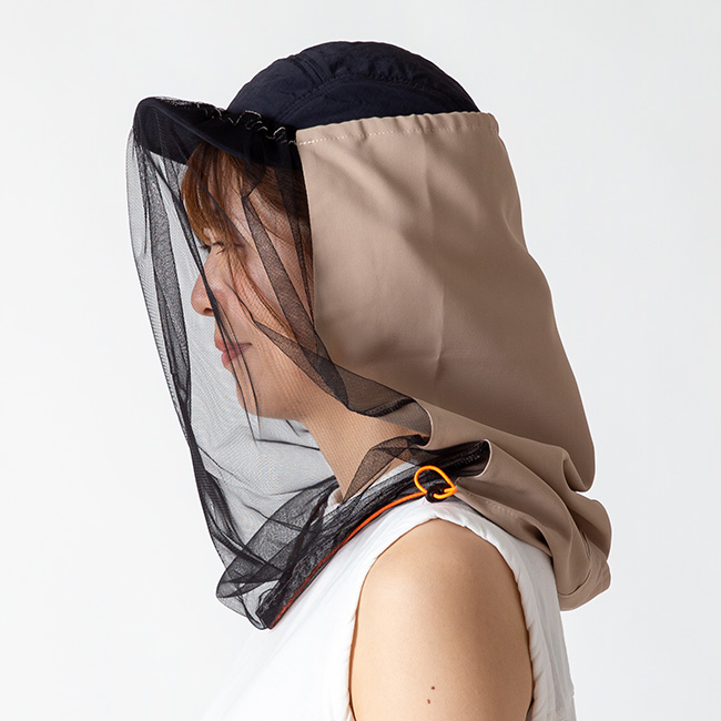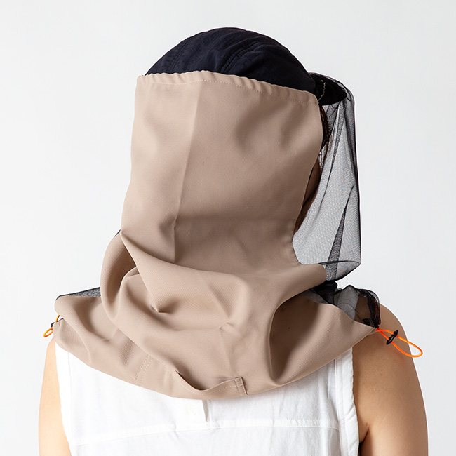 後背面には、UV カット性(UPF50)、通気性、撥水性を持たせ機能面を考慮しています。トップ部分はゴムになっており、様々な帽子に合わせられます。