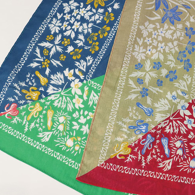 折り方やたたみ方によって、見せるカラーを変えられるのが魅力。首に巻いたり、バッグに掛けたり、ハンカチとして使ったりと、シーンに合わせたアレンジが楽しめます。