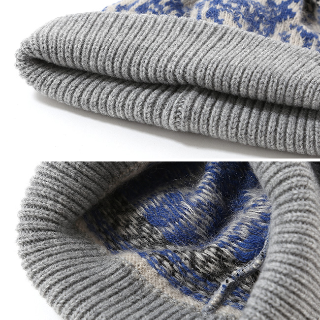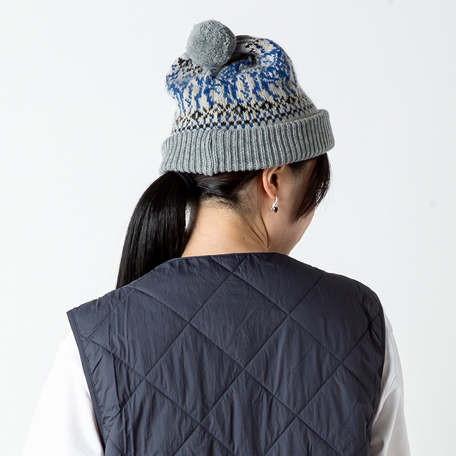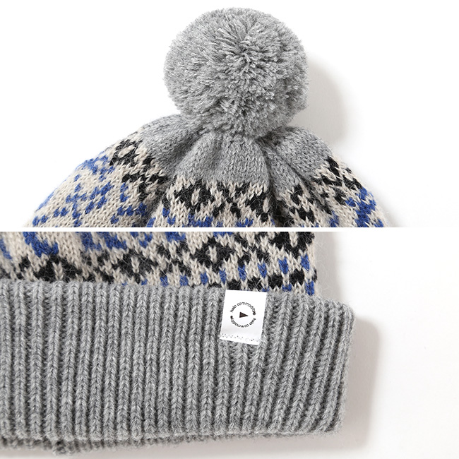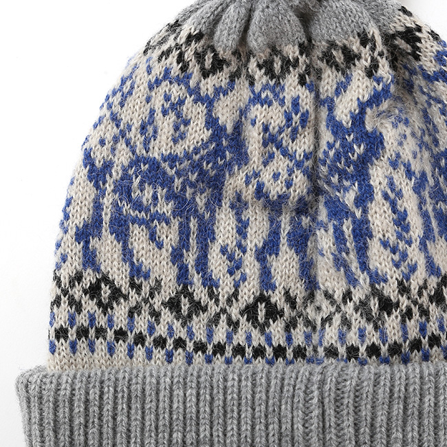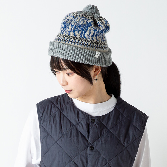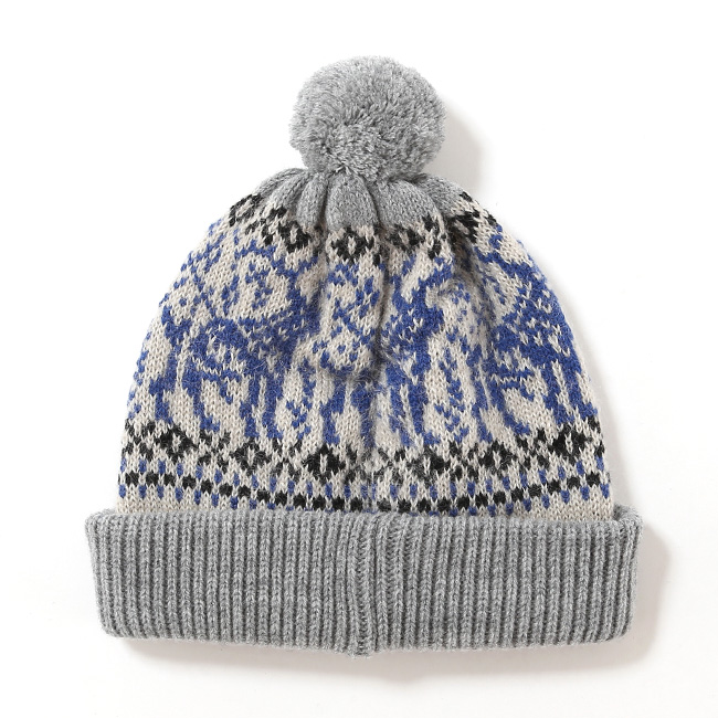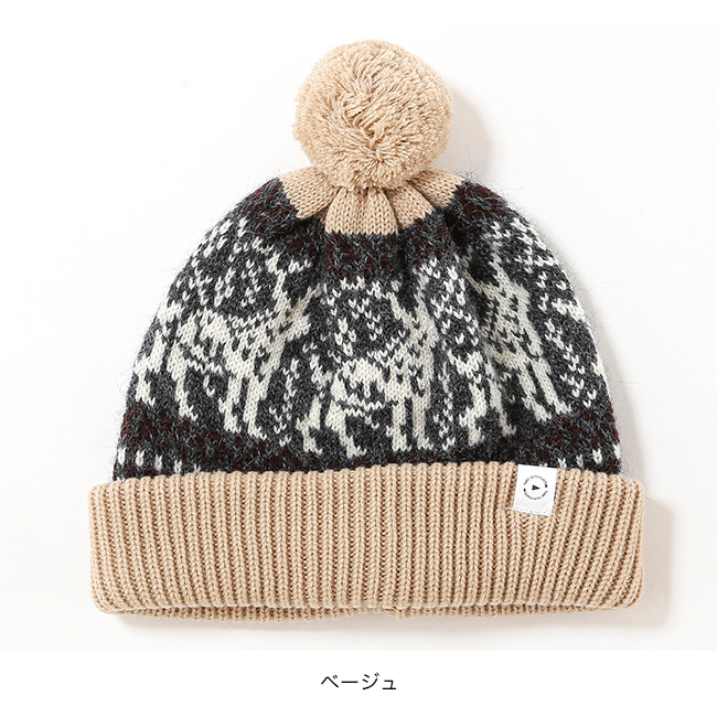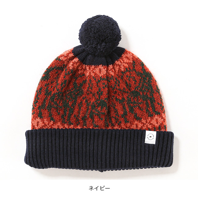 クラシカルな柄が特徴のボンボン付きニット帽。