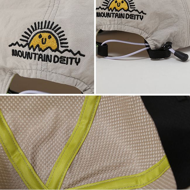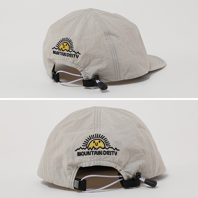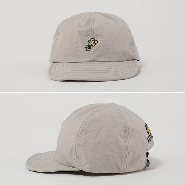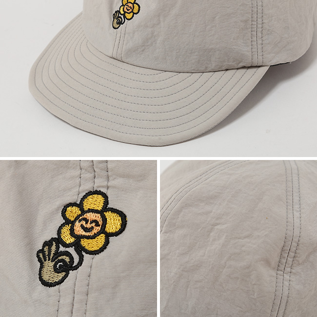 裏地にはメッシュを配し、ドローコードで被ったまま簡単にサイズ調整が可能です。前後にあしらった花刺繍がさりげないアクセントとなり、塩縮加工によるヴィンテージ調とともに、表情豊かなデザインに仕上げました。