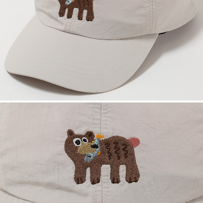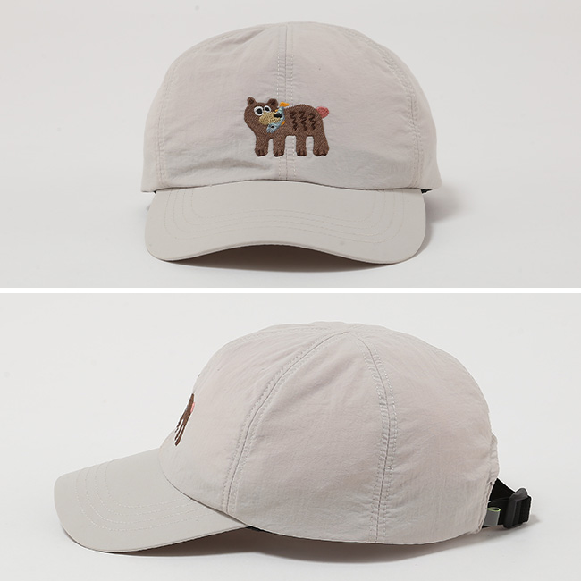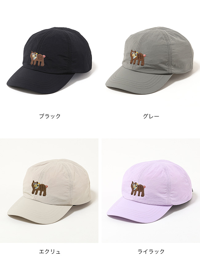 軽量ながら耐久性に優れ、撥水性と紫外線遮蔽率 90%以上の UV カット機能を兼ね備えています。フロントに配した熊の刺繍がアクセントとなり、機能性と遊び心をバランスよく備えたデザイン。
