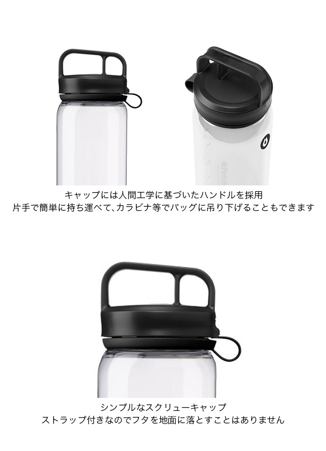 シンプルなスクリューキャップで飲みやすく、ストラップ付きなのでフタを地面に落としたり、失くしたりするのを防ぎます。