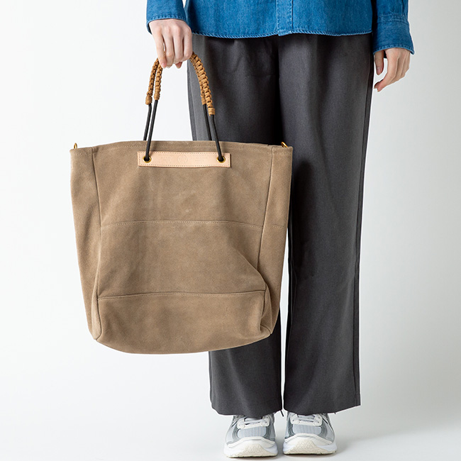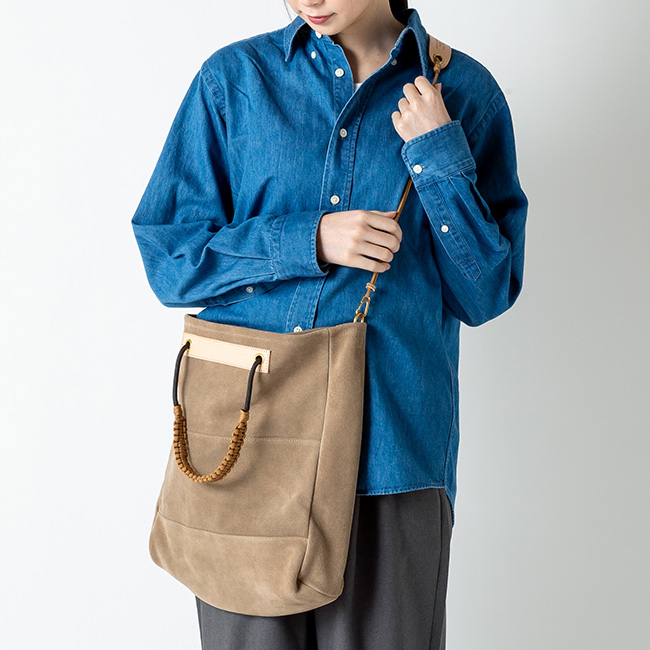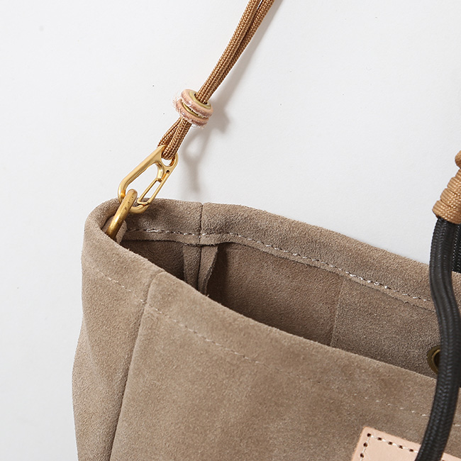 手触りの良いスェード生地とヌメ革を使用し、経年変化が楽しめます。独自のロープの結び方によりハンドルの調節が自在に可能です。