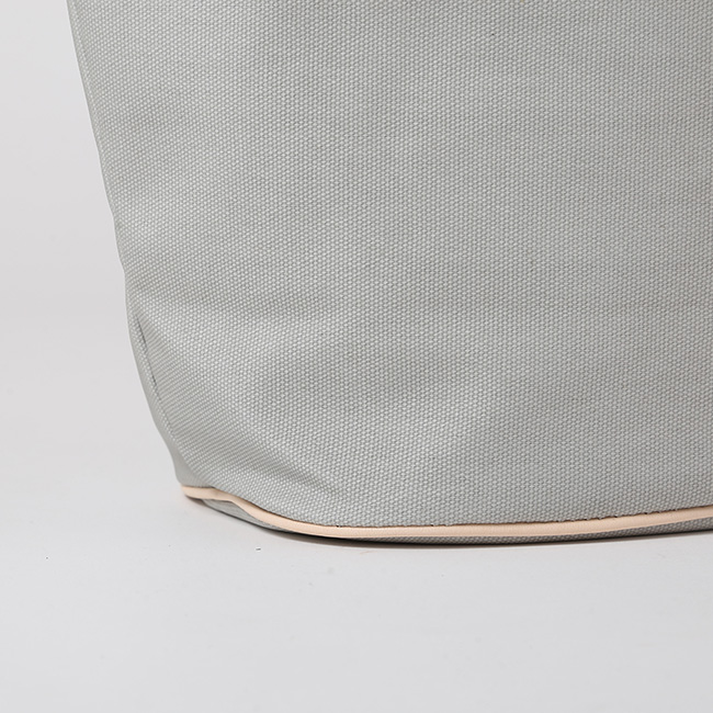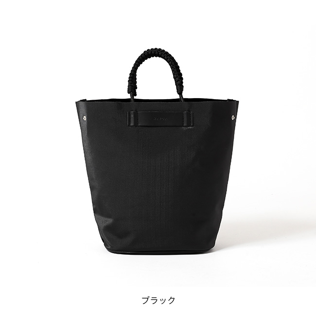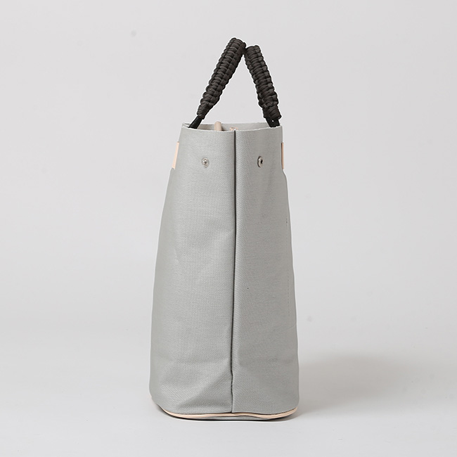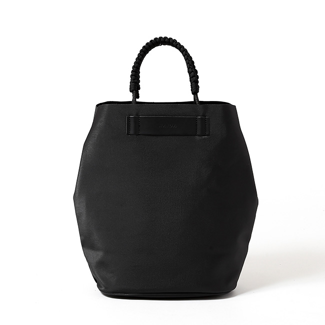 オールハンドメイドのハンドル部分がアクセントとして効いています。両サイドのスナップボタンを留めることで、シルエットに変化をつけることも可能です。