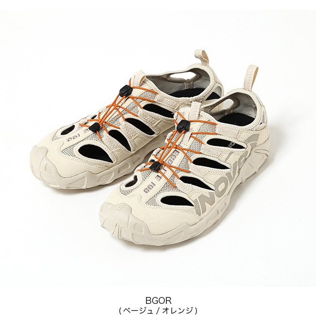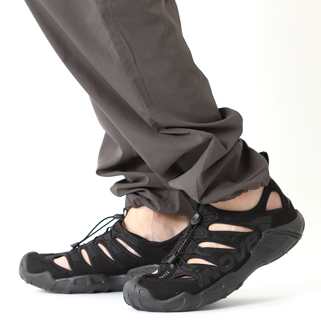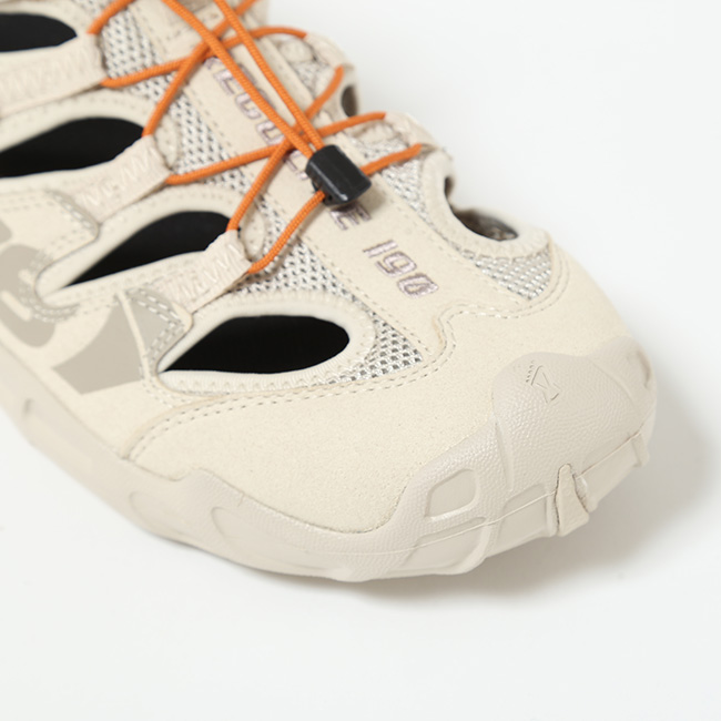 かかと部分までしっかりホールドしつつ、クイックシューレース構造で着脱が容易。つま先やサイド部分に配した補強部材により、岩や石などの侵入を防ぐことを考慮した設計。