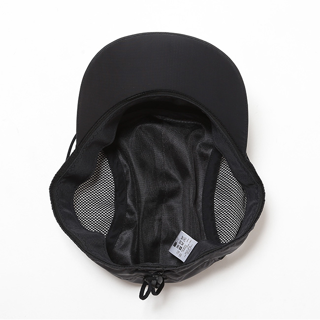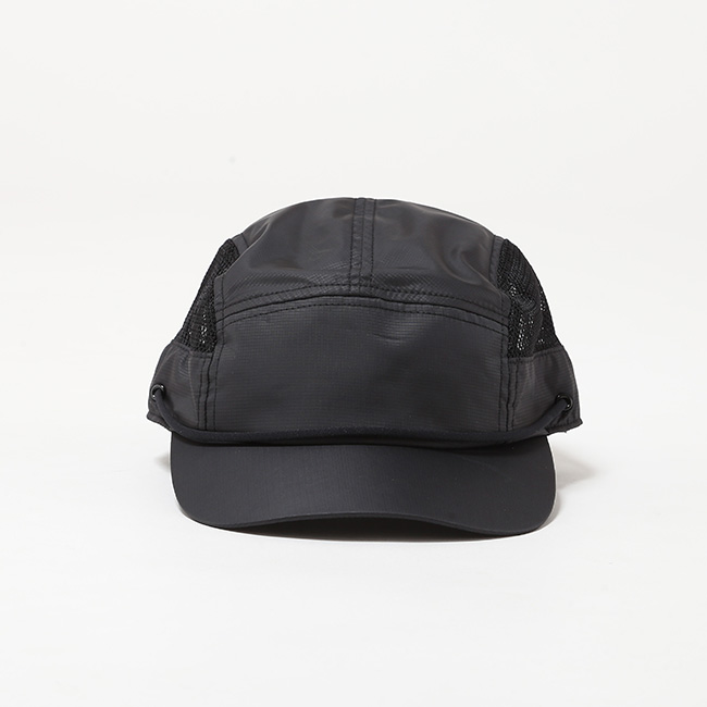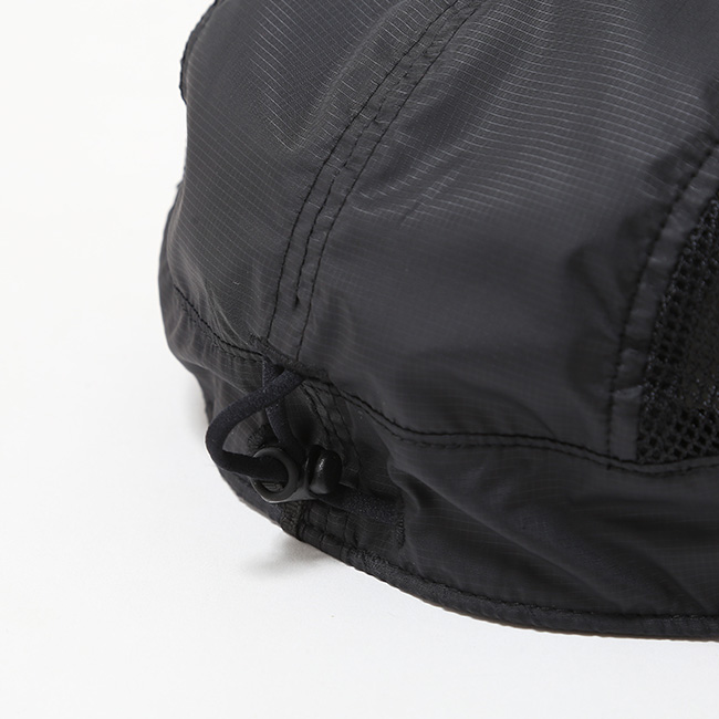 ツバ根元の紐は簡単な操作で伸ばすことができ、強風時に頼りになる「あご紐」として使用できる個性的なメッシュキャップ。サイドパネルにはメッシュ素材を配置して通気性を確保。