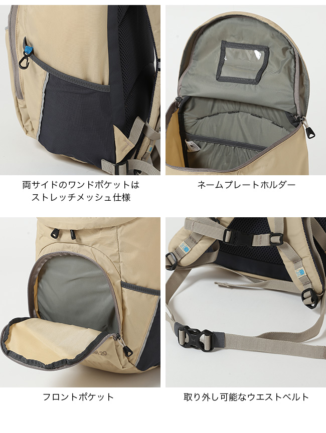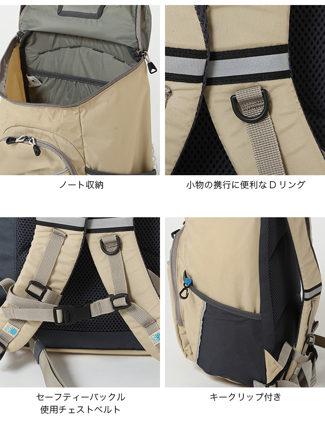 コンパクトな小型リュックサックですが、トレッキングやアウトドアで活躍する機能をふんだんに盛り込んだ、実用的なモデルとなっています。夜間でも存在をアピールできるリフレクトテープ(反射材)や、携行時の安定性・フィット感を向上させるチェストストラップ、紛失時などに役立つネームプレートホルダー付き。