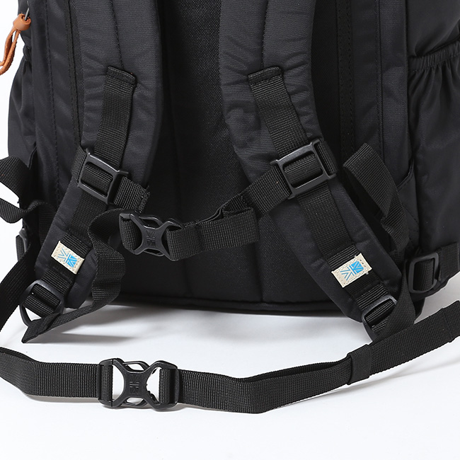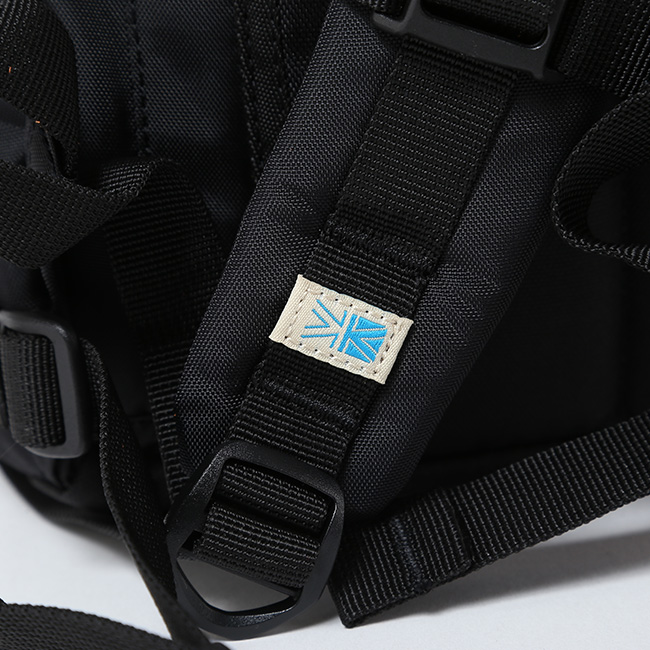 機能性を高めるだけでなく、アウトドアテイスト溢れるデザインのアクセントにもなる、カラビナなどをかけることのできるデイジーチェーンをフロント部分に装備。ゆったりとしたメインコンパートメント内には、メッシュポケットを装備しているため、ワレットやコンパクトカメラなどの小物の取り出しに便利。