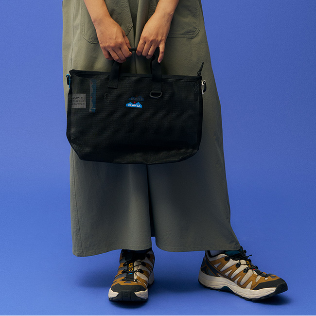メッシュ越しにチラリと覗くKAVUのウェビングディテールと、必需品をしっかり守る丈夫なポリ底が特徴。中身が見えるメッシュ仕様なので、ぜひお気に入りのデザインのポーチや小物を入れてお使いください!