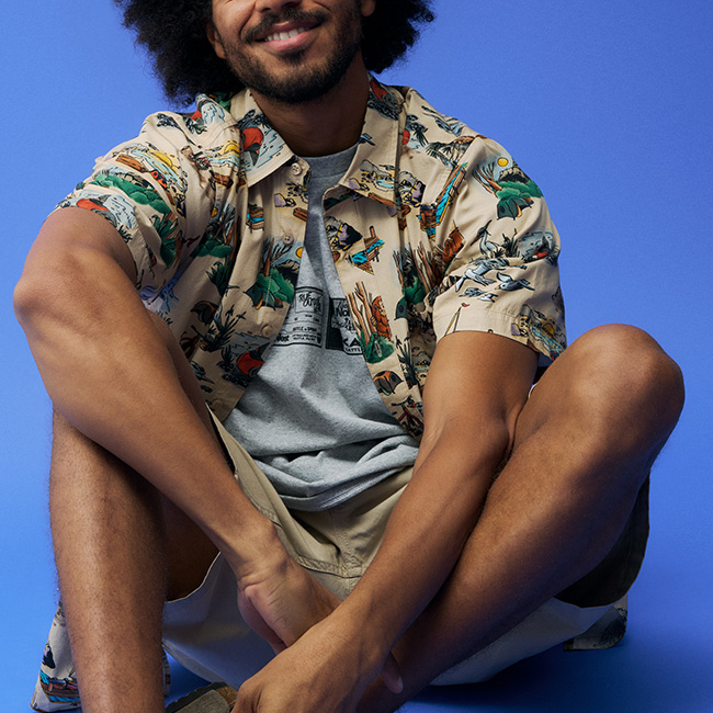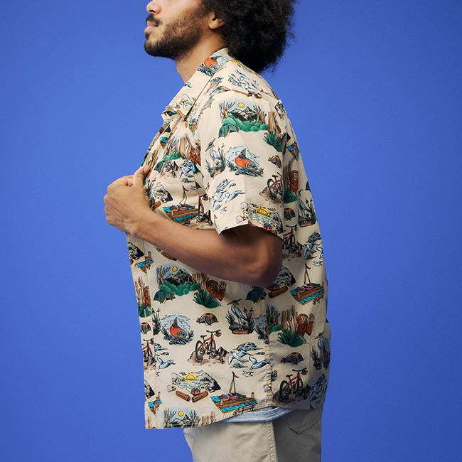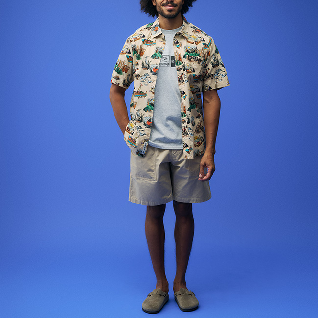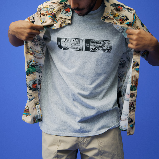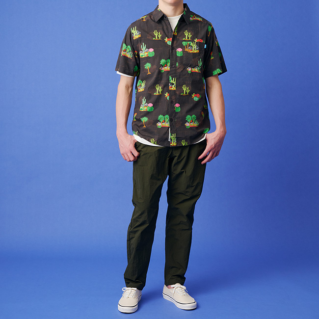 KAVUでは生地のグラフィックを1から手掛けているため、なかなかお見掛けしない個性的な柄のシャツ。ゆったりとした着心地と首袖周りで、ゆったりとした着心地に胸ポケットがアクセント。