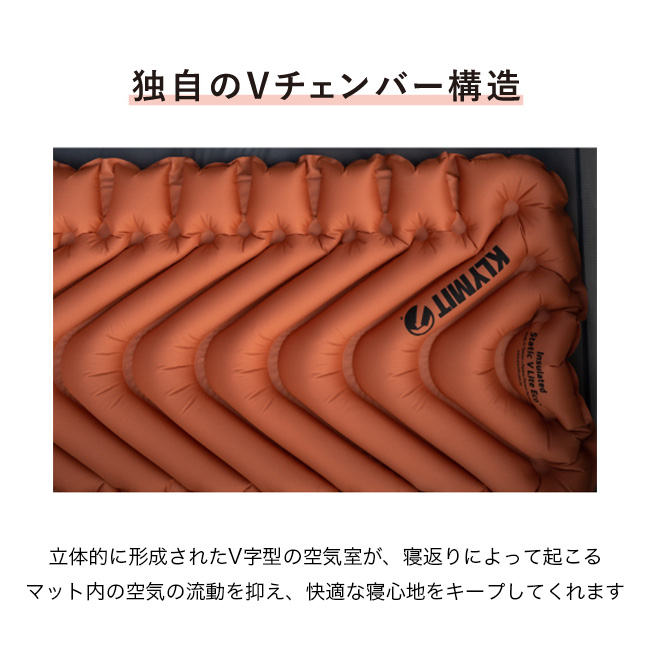 KLYMIT独自のVチェンバー構造により、寝返りで起こるマット内の空気の流動を最小限に抑え、どんなフィールドでも快適な寝心地を実現。