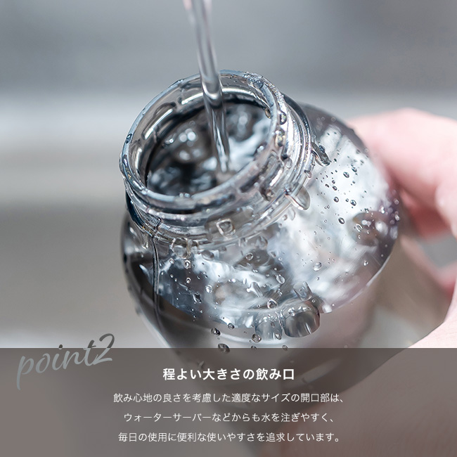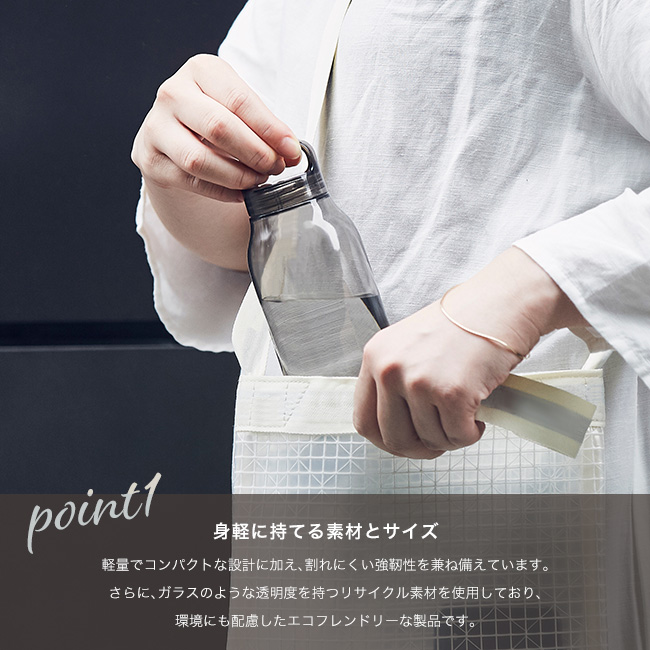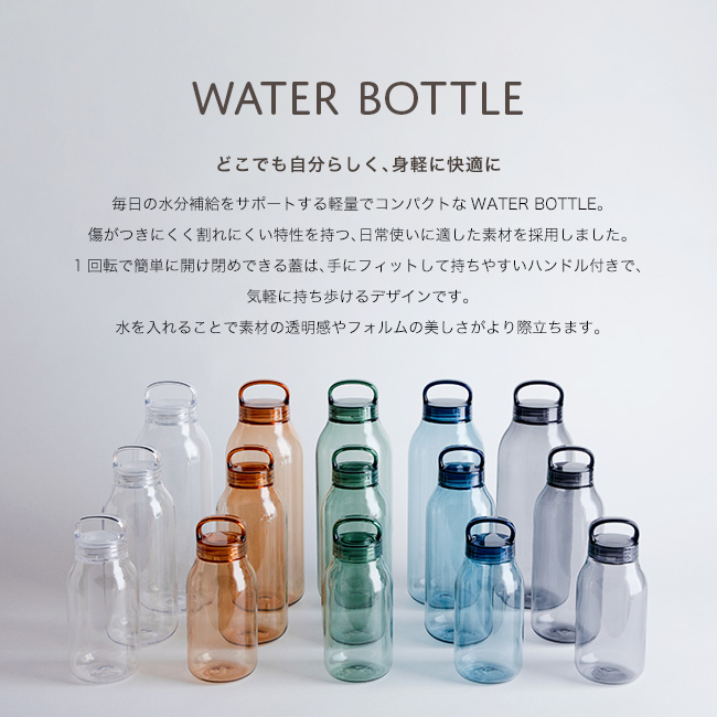 毎日の水分補給をサポートする軽量でコンパクトなWATER BOTTLE。傷がつきにくく割れにくい特性を持つ、日常使いに適した素材を採用しました。
