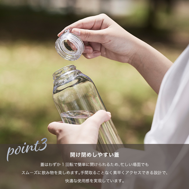 1回転で簡単に開け閉めできる蓋は、手にフィットして持ちやすいハンドル付きで、気軽に持ち歩けるデザインです。