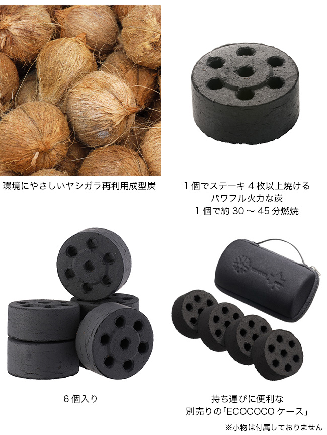 ヤシガラ廃材を再利用した、地球にやさしいヤシガラ成型炭。1個でステーキ4枚以上焼けるエコココロゴス・ミニラウンドストーブ6個入り。