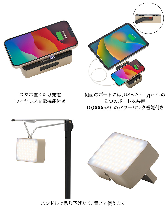 ・ワイヤレス充電・USB・Type-Cに対応する10000mAhパワーのランタン