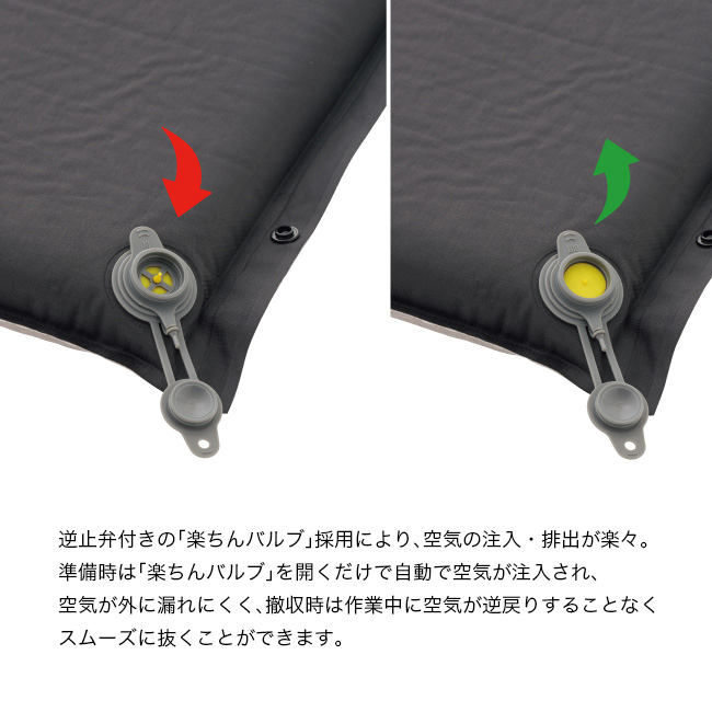 逆止弁付きの「楽ちんバルブ」を採用しているため、バルブを開くだけで自動的に空気が入り、排出時も逆流を防いでスムーズ。