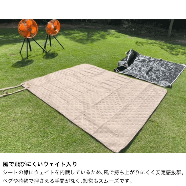 ウェイト入り構造で、風に強く、設置も撤収もスマートなレジャーシート。四隅に荷物を置く必要がなく、風でめくれにくいのが特長。