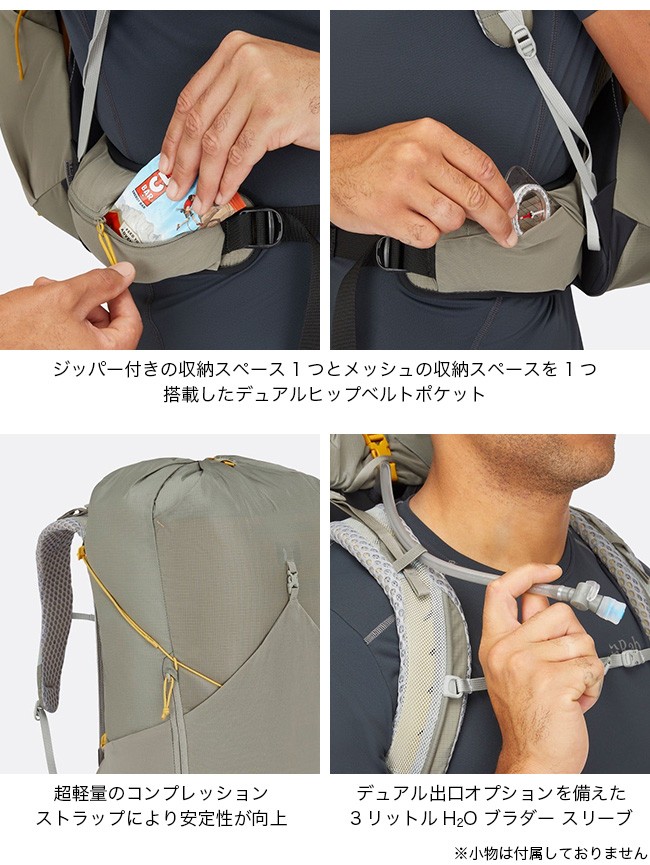 3L の水袋を収納できるスペースを備えているので、トレイル上で水分補給を続けることができ、不要なときはアタッチメント ポイントにウォーキング ポールを収納できます。