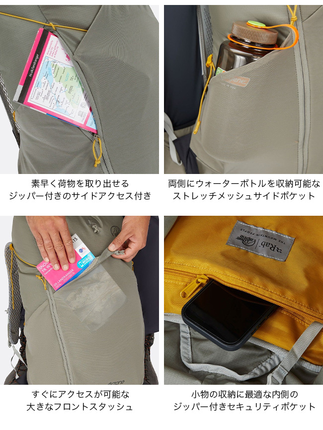 濡れたギアや追加のレイヤーを大きなフロントスタッシュポケットに収納でき、さらに 2 つのストレッチメッシュサイドポケットにはウォーターボトルやその他の移動中に必要な必需品を収納できます。