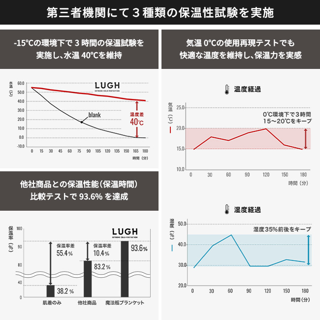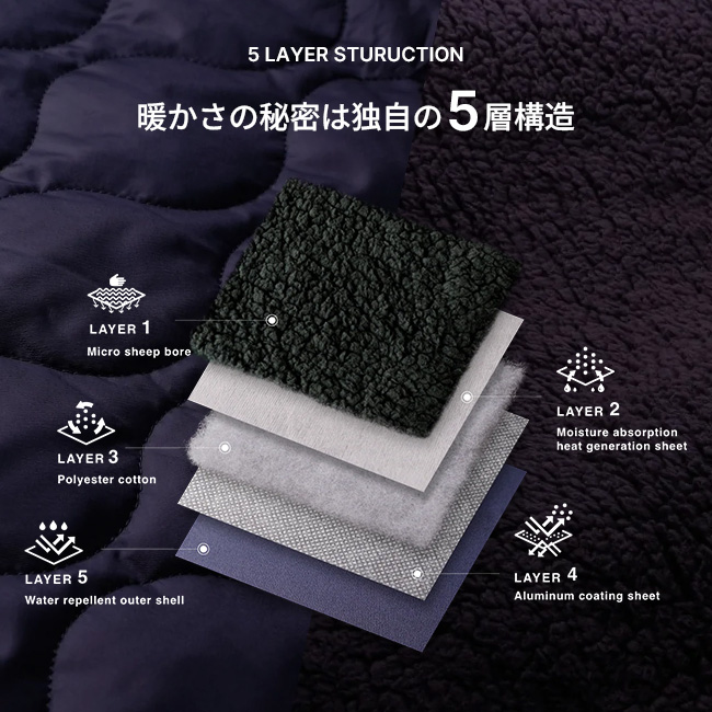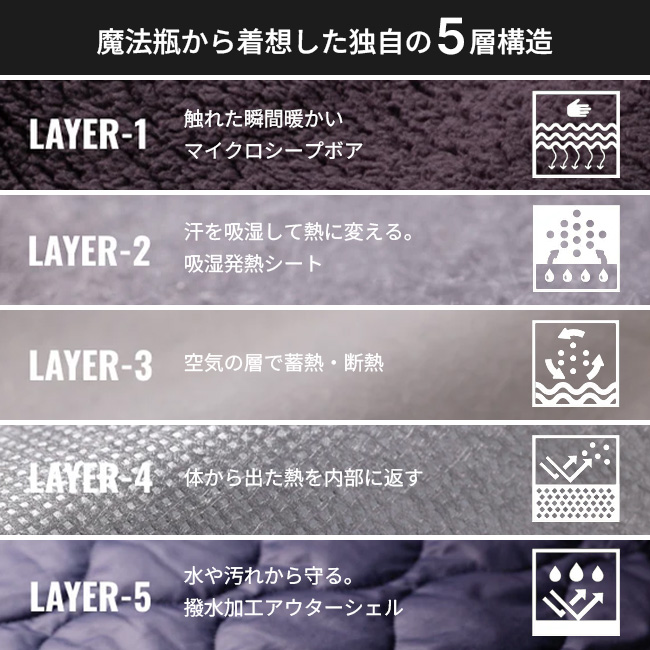車中泊キャンプのために生まれた「魔法瓶ブランケットLUGH」は、独自の5層構造でマイナス15℃の環境下でも保温力が持続。体温を暖かく保ちつつ湿度を程よく吸収しるため、快適な冬の車中泊・バンライフを過ごすことができます。