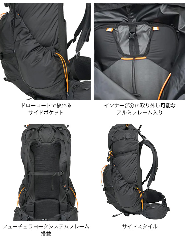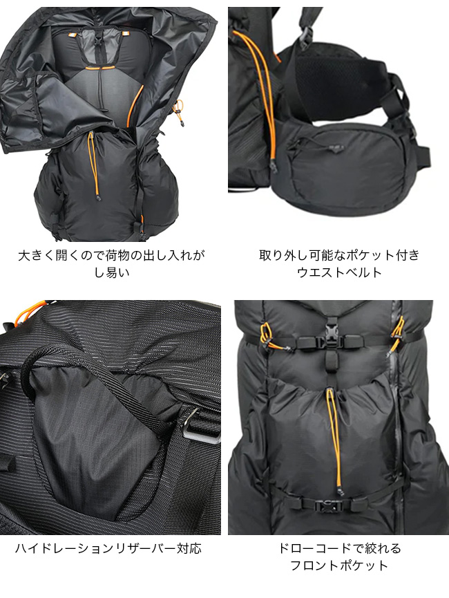 仲間と共にお酒、食材を運んでの小屋泊や夏季テント泊、ウェストを外してのバックパックスタイルでの旅行まで幅広くこなせる容量帯。日帰り登山でご家族分の装備まで運ぶ力持ちにもオススメです。ミニマム装備での公共交通機関を用いたキャンプスタイルもスタイリッシュにこなせるでしょう。
