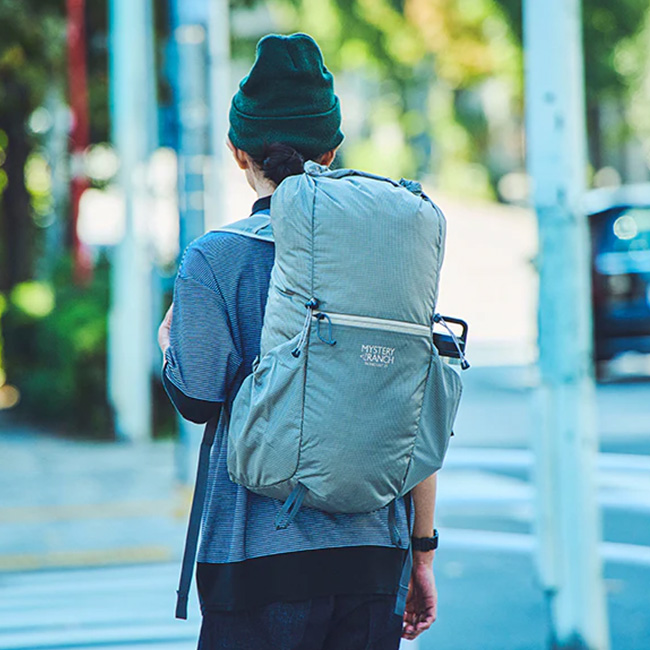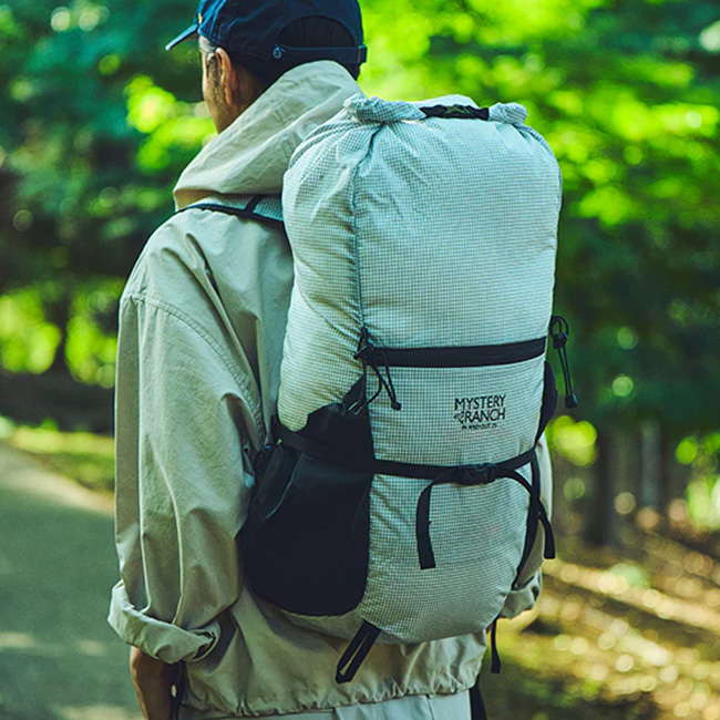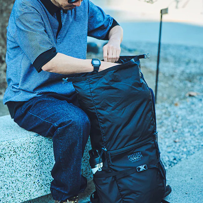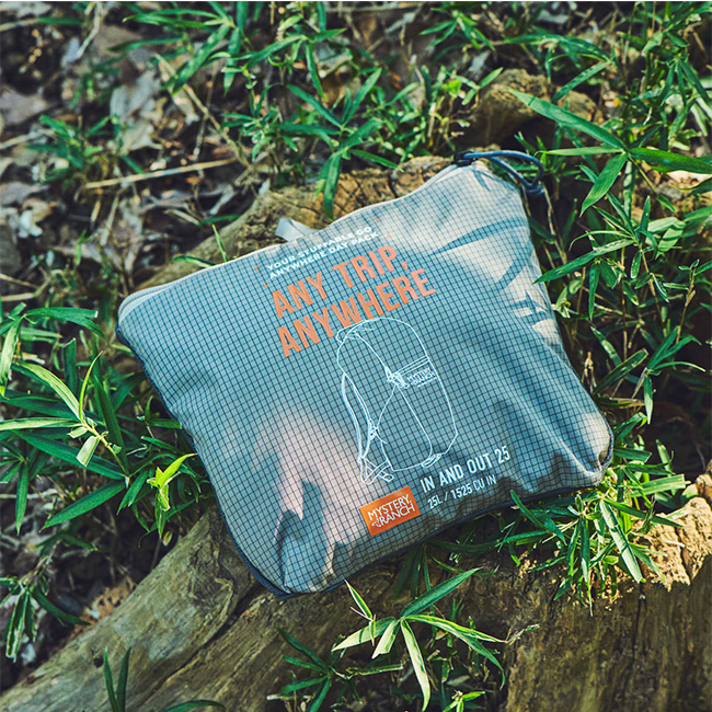 MYSTERYRANCH ミステリーランチ インアンドアウト25 は、折り畳み式でコンパクトになる軽量なバックパックです。旅行のサブバッグとして、または登山時の軽量で耐久性のあるパックとして、さらにはスタイリッシュにアウトドアミックスコーディネートを楽しむ街使いとしても、シームレスに活躍します。